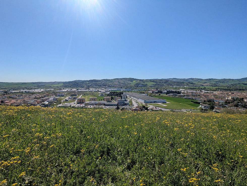 The view from the Castle wall showing why this was an important German observation point. The Gradara cemetery is circled. The view from this aspect gives no clue on the unique configuration of the cemetery.