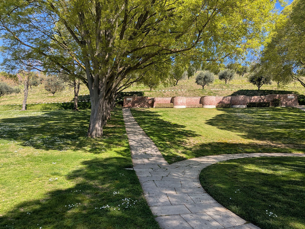 The platform provides a vantage point over the cemetery. Because the burial area slopes downward, the platform allows visitors to look out across the entire cemetery before walking down into it. This is a deliberate CWGC design principle used in many Italian campaign cemeteries. It forms the architectural “front” of the cemetery and frames the visitor’s approach and provides a place for ceremonies.