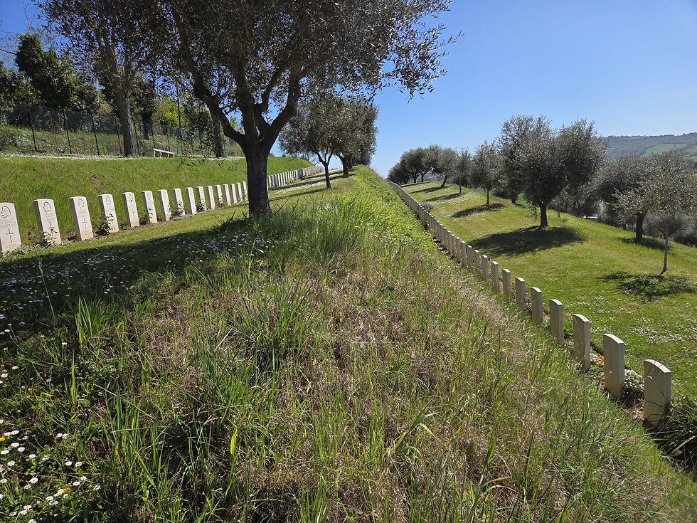 Gradara War Cemetery contains 1181 burials including 369 Canadians, and 8 Hussars. This unique cemetery is built on a very steep hill with 8 terraced rows of headstones. The steep terraces mean that only one or two rows are visible from any location.